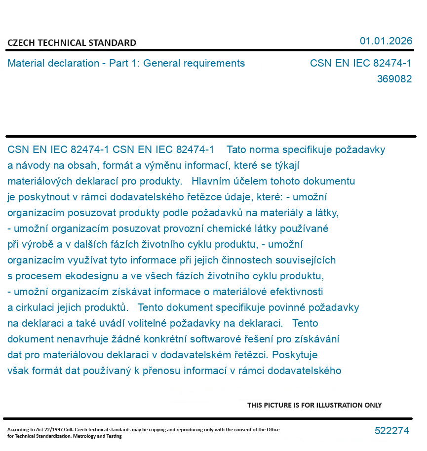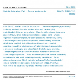 CSN EN IEC 82474-1 Tato norma specifikuje požadavky a návody na obsah, formát a výměnu informací, které se týkají materiálových deklarací pro produkty. Hlavním účelem tohoto dokumentu je poskytnout v rámci dodavatelského řetězce údaje, které: - umožní organizacím posuzovat produkty podle požadavků na materiály a látky, - umožní organizacím posuzovat provozní chemické látky používané při výrobě a v dalších fázích životního cyklu produktu, - umožní organizacím využívat tyto informace při jejich činnostech souvisejících s procesem ekodesignu a ve všech fázích životního cyklu produktu, - umožní organizacím získávat informace o materiálové efektivnosti a cirkulaci jejich produktů. Tento dokument specifikuje povinné požadavky na deklaraci a také uvádí volitelné požadavky na deklaraci. Tento dokument nenavrhuje žádné konkrétní softwarové řešení pro získávání dat pro materiálovou deklaraci v dodavatelském řetězci. Poskytuje však formát dat používaný k přenosu informací v rámci dodavatelského řetězce. Organizace mohou určit nejvhodnější metodu pro získávání dat pro materiálovou deklaraci, aniž by byla ohrožena použitelnost a kvalita dat. Účelem tohoto dokumentu je umožnění vytváření deklarace na základě technického posouzení, materiálových deklarací od respondentů (dodavatelů) a/nebo odebírání vzorků a zkoušení. Tento dokument má status horizontální publikace podle Pokynu IEC 123:2025.