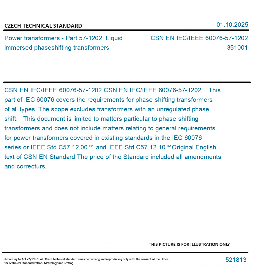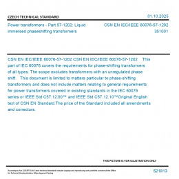 CSN EN IEC/IEEE 60076-57-1202 This part of IEC 60076 covers the requirements for phase-shifting transformers of all types. The scope excludes transformers with an unregulated phase shift. This document is limited to matters particular to phase-shifting transformers and does not include matters relating to general requirements for power transformers covered in existing standards in the IEC 60076 series or IEEE Std C57.12.00™ and IEEE Std C57.12.10™ Original English text of CSN EN Standard. The price of the Standard included all amendments and correcturs.