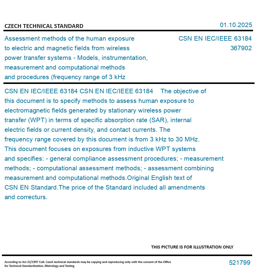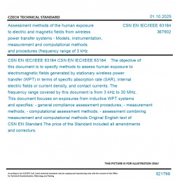 CSN EN IEC/IEEE 63184 The objective of this document is to specify methods to assess human exposure to electromagnetic fields generated by stationary wireless power transfer (WPT) in terms of specific absorption rate (SAR), internal electric fields or current density, and contact currents. The frequency range covered by this document is from 3 kHz to 30 MHz. This document focuses on exposures from inductive WPT systems and specifies: - general compliance assessment procedures; - measurement methods; - computational assessment methods; - assessment combining measurement and computational methods. Original English text of CSN EN Standard. The price of the Standard included all amendments and correcturs.