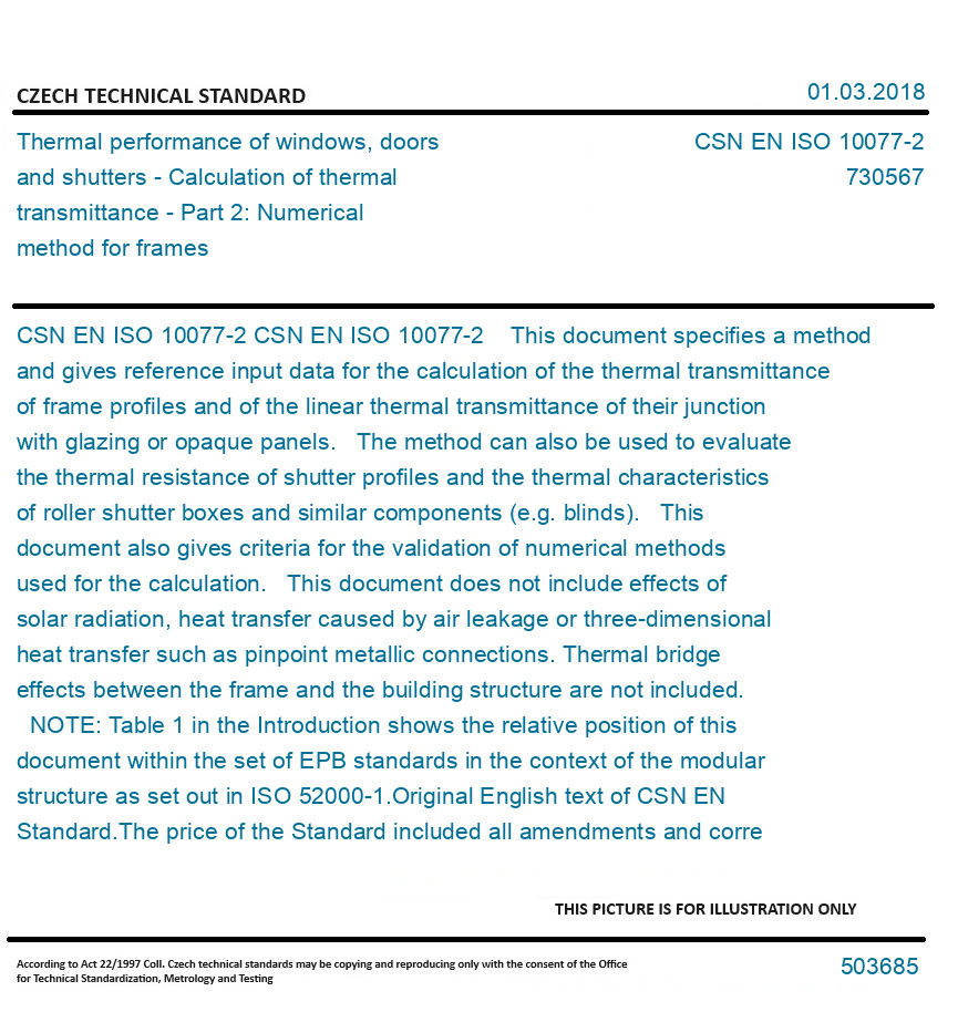 CSN EN ISO 10077-2 This document specifies a method and gives reference input data for the calculation of the thermal transmittance of frame profiles and of the linear thermal transmittance of their junction with glazing or opaque panels. The method can also be used to evaluate the thermal resistance of shutter profiles and the thermal characteristics of roller shutter boxes and similar components (e.g. blinds). This document also gives criteria for the validation of numerical methods used for the calculation. This document does not include effects of solar radiation, heat transfer caused by air leakage or three-dimensional heat transfer such as pinpoint metallic connections. Thermal bridge effects between the frame and the building structure are not included. NOTE: Table 1 in the Introduction shows the relative position of this document within the set of EPB standards in the context of the modular structure as set out in ISO 52000-1. Original English text of CSN EN Standard. The price of the Standard included all amendments and correcturs.