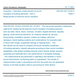 CSN EN ISO 10140-2 This document specifies a laboratory method for measuring the airborne sound insulation of building products, such as walls, floors, doors, windows, shutters, façade elements, façades, glazing, small technical elements, for instance transfer air devices, airing panels (ventilation panels), outdoor air intakes, electrical raceways, transit sealing systems and combinations, for example walls or floors with linings, suspended ceilings or floating floors. The test results can be used to compare the sound insulation properties of building elements, classify elements according to their sound insulation capabilities, help design building products which require certain acoustic properties and estimate the in situ performance in complete buildings. The measurements are performed in laboratory test facilities in which sound transmission via flanking paths is suppressed. The results of measurements made in accordance with this document are not applicable directly to the field situation without accounting for other factors affecting sound insulation, such as flanking transmission, boundary conditions and total loss factor.