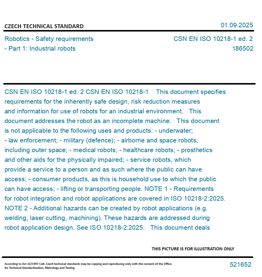 CSN EN ISO 10218-1 This document specifies requirements for the inherently safe design, risk reduction measures and information for use of robots for an industrial environment. This document addresses the robot as an incomplete machine. This document is not applicable to the following uses and products: - underwater; - law enforcement; - military (defence); - airborne and space robots, including outer space; - medical robots; - healthcare robots; - prosthetics and other aids for the physically impaired; - service robots, which provide a service to a person and as such where the public can have access; - consumer products, as this is household use to which the public can have access; - lifting or transporting people. NOTE 1 - Requirements for robot integration and robot applications are covered in ISO 10218-2:2025. NOTE 2 - Additional hazards can be created by robot applications (e.g. welding, laser cutting, machining). These hazards are addressed during robot application design. See ISO 10218-2:2025. This document deals with the significant hazards, hazardous situations or hazardous events when used as intended and under specified conditions of misuse which are reasonably foreseeable by the manufacturer. This document does not cover the hazards related to: - severe conditions (e.g. extreme climates, freezer use, strong magnetic fields) outside of manufacturer's specifications; - underground use; - use that has hygienic requirements; - use in nuclear environments; - use in potentially explosive environments; - mobility when robots or manipulators are fixed to or part of driverless industrial trucks; - mobility when robots or manipulators are fixed to or part of mobile platforms; - use in environments with ionizing and non-ionizing radiation levels; - hazardous ionizing and non-ionizing radiation; - handling loads the nature of which can lead to dangerous situations (e.g. molten metals, acids/bases, radiating materials); - handling or lifting or transporting people; - when the public, all ages or non-working adults have access (e.g. service robots, consumer products). Noise emission is generally not considered a significant hazard of the robot alone, and consequently noise is excluded from the scope of this document. This document is not applicable to robots that are manufactured before the date of its publication. Original English text of CSN EN Standard. The price of the Standard included all amendments and correcturs.