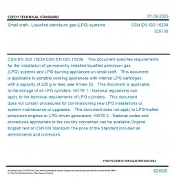 CSN EN ISO 10239 This document specifies requirements for the installation of permanently installed liquefied petroleum gas (LPG) systems and LPG-burning appliances on small craft. This document is applicable to portable cooking appliances with internal LPG cartridges, with a capacity of 225 g or less (see Annex D). This document is applicable to the storage of all LPG cylinders. NOTE 1 - National regulations can apply to the technical requirements of LPG cylinders. This document does not contain procedures for commissioning new LPG installations or system maintenance or upgrades. This document does not apply to LPG-fuelled propulsion engines or LPG-driven generators. NOTE 2 - National codes and procedures appropriate to the country concerned can be available. Original English text of CSN EN Standard. The price of the Standard included all amendments and correcturs.