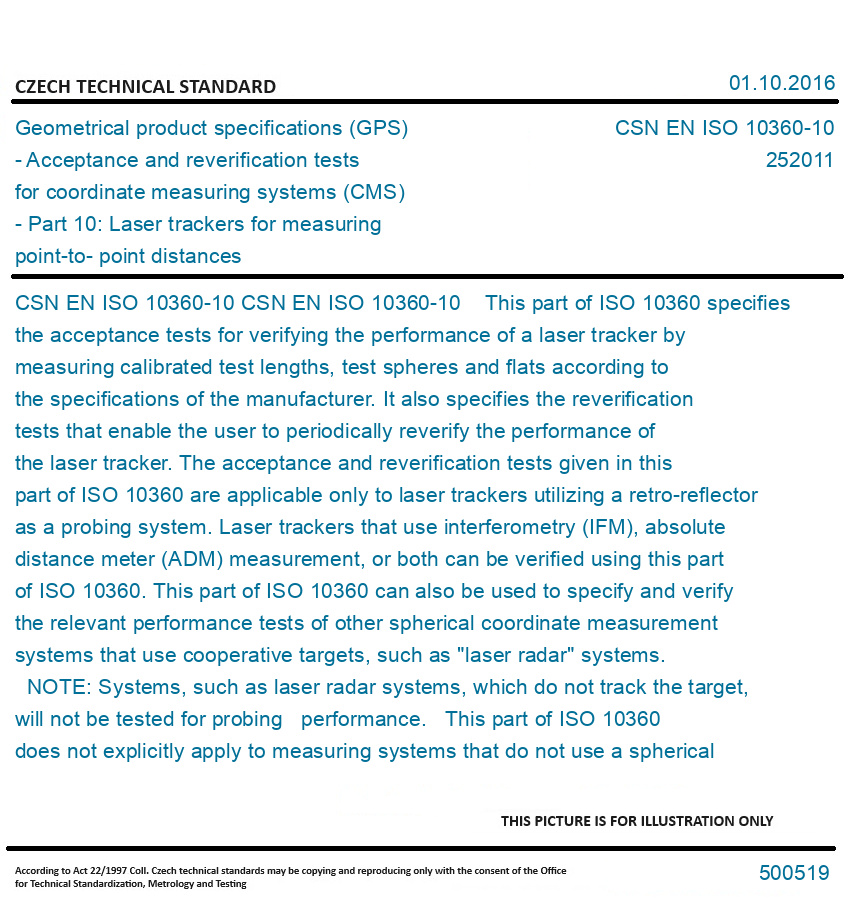 CSN EN ISO 10360-10 This part of ISO 10360 specifies the acceptance tests for verifying the performance of a laser tracker by measuring calibrated test lengths, test spheres and flats according to the specifications of the manufacturer. It also specifies the reverification tests that enable the user to periodically reverify the performance of the laser tracker. The acceptance and reverification tests given in this part of ISO 10360 are applicable only to laser trackers utilizing a retro-reflector as a probing system. Laser trackers that use interferometry (IFM), absolute distance meter (ADM) measurement, or both can be verified using this part of ISO 10360. This part of ISO 10360 can also be used to specify and verify the relevant performance tests of other spherical coordinate measurement systems that use cooperative targets, such as "laser radar" systems. NOTE: Systems, such as laser radar systems, which do not track the target, will not be tested for probing performance. This part of ISO 10360 does not explicitly apply to measuring systems that do not use a spherical coordinate system (i.e. two orthogonal rotary axes having a common intersection point with a third linear axis in the radial direction). However, the parties can apply this part of ISO 10360 to such systems by mutual agreement. This part of ISO 10360 specifies - performance requirements that can be assigned by the manufacturer or the user of the laser tracker, - the manner of execution of the acceptance and reverification tests to demonstrate the stated requirements, - rules for proving conformance, and - applications for which the acceptance and reverification tests can be used. Original English text of CSN EN Standard. The price of the Standard included all amendments and correcturs.