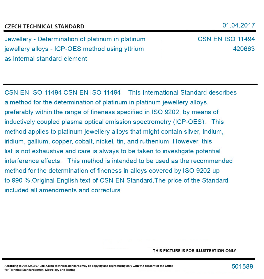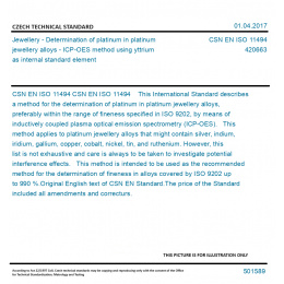 CSN EN ISO 11494 This International Standard describes a method for the determination of platinum in platinum jewellery alloys, preferably within the range of fineness specified in ISO 9202, by means of inductively coupled plasma optical emission spectrometry (ICP-OES). This method applies to platinum jewellery alloys that might contain silver, indium, iridium, gallium, copper, cobalt, nickel, tin, and ruthenium. However, this list is not exhaustive and care is always to be taken to investigate potential interference effects. This method is intended to be used as the recommended method for the determination of fineness in alloys covered by ISO 9202 up to 990 %. Original English text of CSN EN Standard. The price of the Standard included all amendments and correcturs.