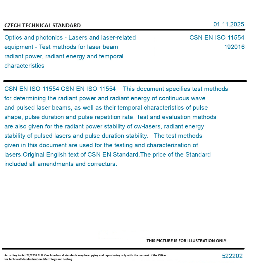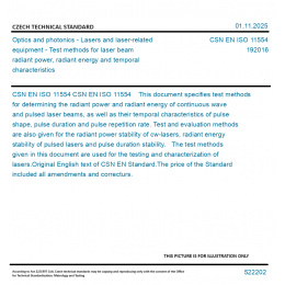 CSN EN ISO 11554 This document specifies test methods for determining the radiant power and radiant energy of continuous wave and pulsed laser beams, as well as their temporal characteristics of pulse shape, pulse duration and pulse repetition rate. Test and evaluation methods are also given for the radiant power stability of cw-lasers, radiant energy stability of pulsed lasers and pulse duration stability. The test methods given in this document are used for the testing and characterization of lasers. Original English text of CSN EN Standard. The price of the Standard included all amendments and correcturs.