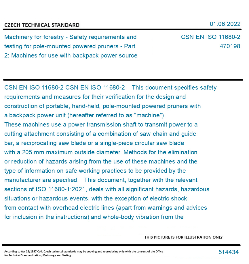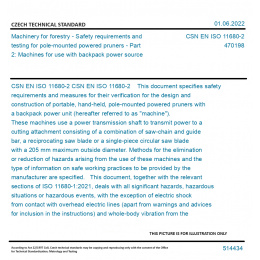 CSN EN ISO 11680-2 This document specifies safety requirements and measures for their verification for the design and construction of portable, hand-held, pole-mounted powered pruners with a backpack power unit (hereafter referred to as "machine"). These machines use a power transmission shaft to transmit power to a cutting attachment consisting of a combination of saw-chain and guide bar, a reciprocating saw blade or a single-piece circular saw blade with a 205 mm maximum outside diameter. Methods for the elimination or reduction of hazards arising from the use of these machines and the type of information on safe working practices to be provided by the manufacturer are specified. This document, together with the relevant sections of ISO 11680-1:2021, deals with all significant hazards, hazardous situations or hazardous events, with the exception of electric shock from contact with overhead electric lines (apart from warnings and advices for inclusion in the instructions) and whole-body vibration from the backpack power unit, relevant to these machines when they are used as intended and under conditions of misuse which are reasonably foreseeable by the manufacturer. NOTE 1 - A standardized test procedure for measuring whole-body vibration from the backpack power unit is not available at the date of publication. NOTE 2 - See Annex A for a list of significant hazards. This document is applicable to portable, hand-held, pole-mounted powered pruners with backpack power unit manufactured after its date of publication. Original English text of CSN EN Standard. The price of the Standard included all amendments and correcturs.