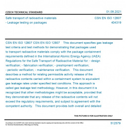 CSN EN ISO 12807 This document specifies gas leakage test criteria and test methods for demonstrating that packages used to transport radioactive materials comply with the package containment requirements defined in the International Atomic Energy Agency (IAEA) Regulations for the Safe Transport of Radioactive Material for: - design verification; - fabrication verification; - preshipment verification; - periodic verification; - maintenance verification. This document describes a method for relating permissible activity release of the radioactive contents carried within a containment system to equivalent gas leakage rates under specified test conditions. This approach is called gas leakage test methodology. However, in this document it is recognized that other methodologies might be acceptable, provided that they demonstrate that any release of the radioactive contents will not exceed the regulatory requirements, and subject to agreement with the competent authority. This document provides both overall and detailed guidance on the complex relationships between an equivalent gas leakage test and a permissible activity release rate. Whereas the overall guidance is universally agreed upon, the use of the detailed guidance shall be agreed upon with the competent authority during the Type B(U), Type B(M) or Type C packages certification process. It should be noted that, for a given package, demonstration of compliance is not limited to a single methodology. While this document does not require particular gas leakage test procedures, it does present minimum requirements for any test that is to be used. It is the responsibility of the package designer or consignor to estimate or determine the maximum permissible release rate of radioactivity to the environment and to select appropriate leakage test procedures that have adequate sensitivity. This document pertains specifically to Type B(U), Type B(M) or Type C packages for which the regulatory containment requirements are specified explicitly. Original English text of CSN EN Standard. The price of the Standard included all amendments and correcturs.