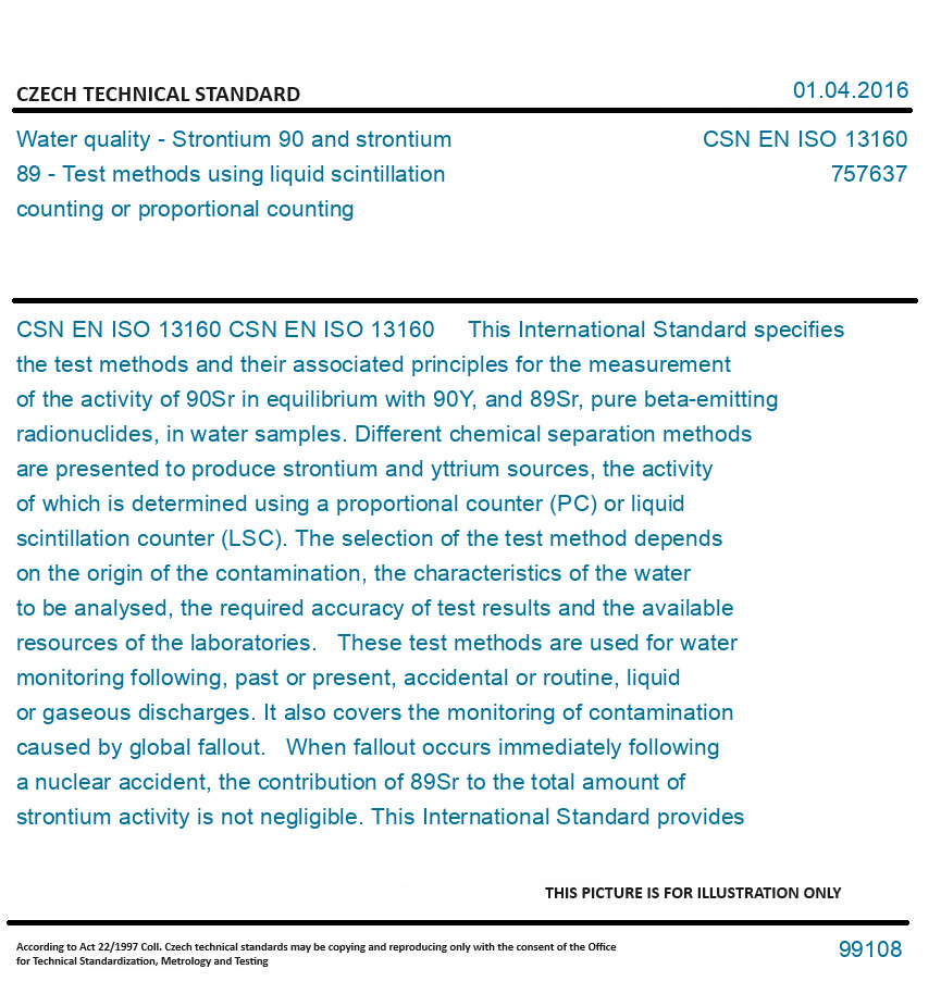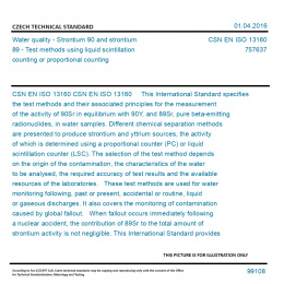 CSN EN ISO 13160 This International Standard specifies the test methods and their associated principles for the measurement of the activity of 90Sr in equilibrium with 90Y, and 89Sr, pure beta-emitting radionuclides, in water samples. Different chemical separation methods are presented to produce strontium and yttrium sources, the activity of which is determined using a proportional counter (PC) or liquid scintillation counter (LSC). The selection of the test method depends on the origin of the contamination, the characteristics of the water to be analysed, the required accuracy of test results and the available resources of the laboratories. These test methods are used for water monitoring following, past or present, accidental or routine, liquid or gaseous discharges. It also covers the monitoring of contamination caused by global fallout. When fallout occurs immediately following a nuclear accident, the contribution of 89Sr to the total amount of strontium activity is not negligible. This International Standard provides the test methods to determine the activity concentration of 90Sr in presence of 89Sr. Original English text of CSN EN Standard. The price of the Standard included all amendments and correcturs.