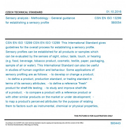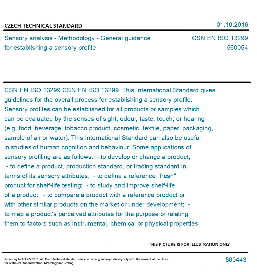 CSN EN ISO 13299 This International Standard gives guidelines for the overall process for establishing a sensory profile. Sensory profiles can be established for all products or samples which can be evaluated by the senses of sight, odour, taste, touch, or hearing (e.g. food, beverage, tobacco product, cosmetic, textile, paper, packaging, sample of air or water). This International Standard can also be useful in studies of human cognition and behaviour. Some applications of sensory profiling are as follows: - to develop or change a product; - to define a product, production standard, or trading standard in terms of its sensory attributes; - to define a reference "fresh" product for shelf-life testing; - to study and improve shelf-life of a product; - to compare a product with a reference product or with other similar products on the market or under development; - to map a product's perceived attributes for the purpose of relating them to factors such as instrumental, chemical or physical properties, and/or to consumer acceptability; - to characterize by type and intensity the off-odours or off-tastes in a sample (e.g. in pollution studies). Original English text of CSN EN Standard. The price of the Standard included all amendments and correcturs.
