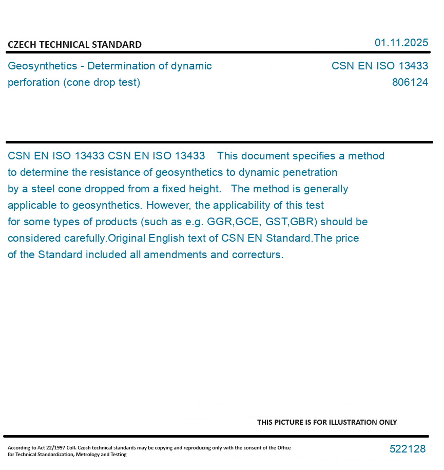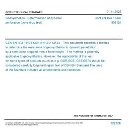 CSN EN ISO 13433 This document specifies a method to determine the resistance of geosynthetics to dynamic penetration by a steel cone dropped from a fixed height. The method is generally applicable to geosynthetics. However, the applicability of this test for some types of products (such as e.g. GGR,GCE, GST,GBR) should be considered carefully. Original English text of CSN EN Standard. The price of the Standard included all amendments and correcturs.