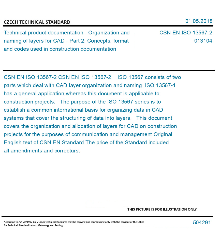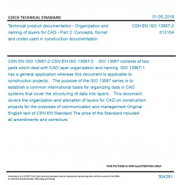 CSN EN ISO 13567-2 ISO 13567 consists of two parts which deal with CAD layer organization and naming. ISO 13567-1 has a general application whereas this document is applicable to construction projects. The purpose of the ISO 13567 series is to establish a common international basis for organizing data in CAD systems that cover the structuring of data into layers. This document covers the organization and allocation of layers for CAD on construction projects for the purposes of communication and management. Original English text of CSN EN Standard. The price of the Standard included all amendments and correcturs.