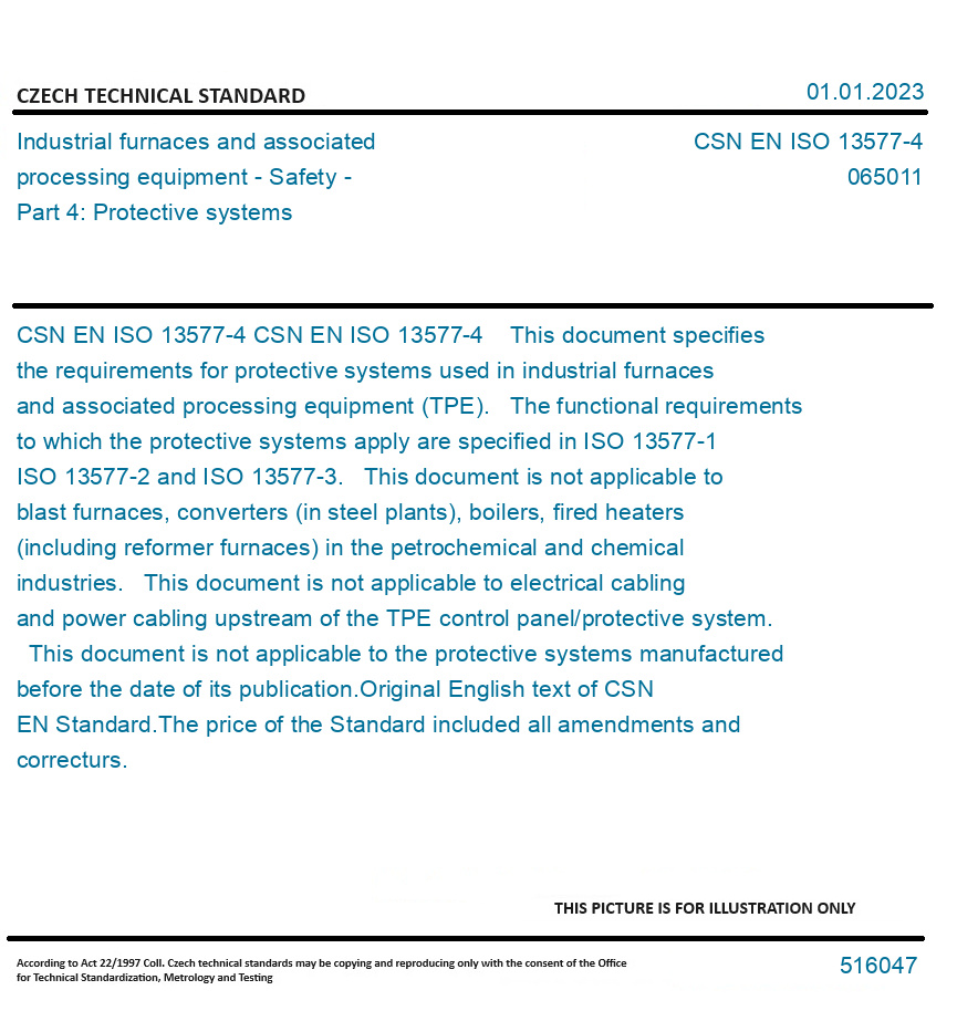 CSN EN ISO 13577-4 This document specifies the requirements for protective systems used in industrial furnaces and associated processing equipment (TPE). The functional requirements to which the protective systems apply are specified in ISO 13577-1 ISO 13577-2 and ISO 13577-3. This document is not applicable to blast furnaces, converters (in steel plants), boilers, fired heaters (including reformer furnaces) in the petrochemical and chemical industries. This document is not applicable to electrical cabling and power cabling upstream of the TPE control panel/protective system. This document is not applicable to the protective systems manufactured before the date of its publication. Original English text of CSN EN Standard. The price of the Standard included all amendments and correcturs.
