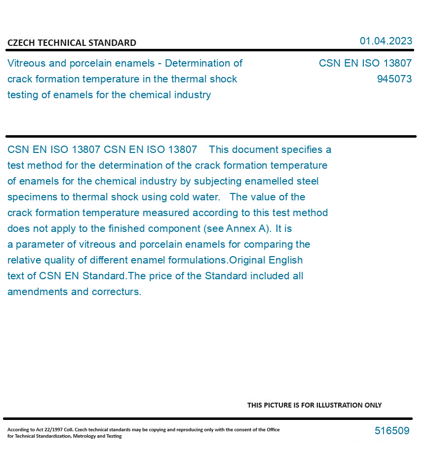 CSN EN ISO 13807 This document specifies a test method for the determination of the crack formation temperature of enamels for the chemical industry by subjecting enamelled steel specimens to thermal shock using cold water. The value of the crack formation temperature measured according to this test method does not apply to the finished component (see Annex A). It is a parameter of vitreous and porcelain enamels for comparing the relative quality of different enamel formulations. Original English text of CSN EN Standard. The price of the Standard included all amendments and correcturs.