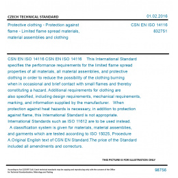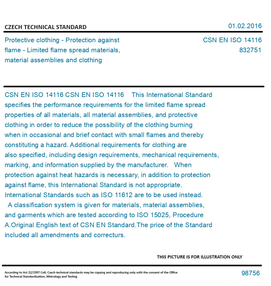 CSN EN ISO 14116 This International Standard specifies the performance requirements for the limited flame spread properties of all materials, all material assemblies, and protective clothing in order to reduce the possibility of the clothing burning when in occasional and brief contact with small flames and thereby constituting a hazard. Additional requirements for clothing are also specified, including design requirements, mechanical requirements, marking, and information supplied by the manufacturer. When protection against heat hazards is necessary, in addition to protection against flame, this International Standard is not appropriate. International Standards such as ISO 11612 are to be used instead. A classification system is given for materials, material assemblies, and garments which are tested according to ISO 15025, Procedure A. Original English text of CSN EN Standard. The price of the Standard included all amendments and correcturs.