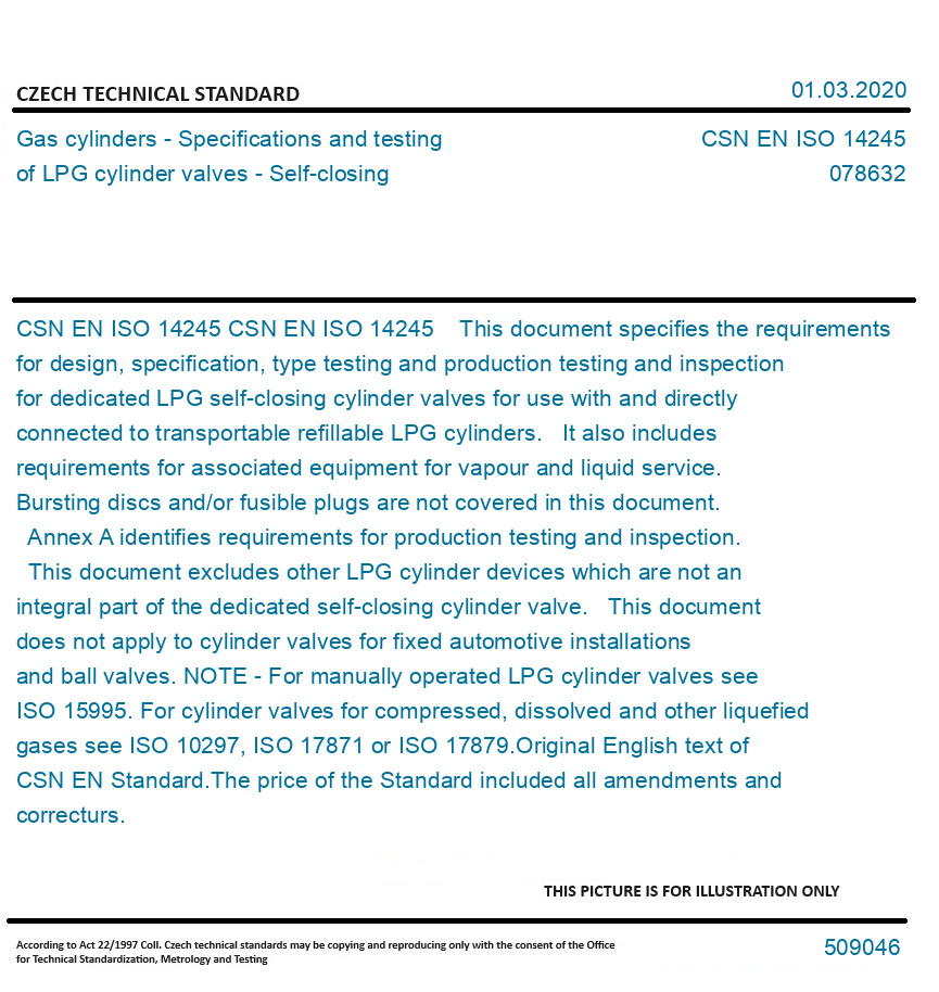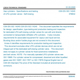 CSN EN ISO 14245 This document specifies the requirements for design, specification, type testing and production testing and inspection for dedicated LPG self-closing cylinder valves for use with and directly connected to transportable refillable LPG cylinders. It also includes requirements for associated equipment for vapour and liquid service. Bursting discs and/or fusible plugs are not covered in this document. Annex A identifies requirements for production testing and inspection. This document excludes other LPG cylinder devices which are not an integral part of the dedicated self-closing cylinder valve. This document does not apply to cylinder valves for fixed automotive installations and ball valves. NOTE - For manually operated LPG cylinder valves see ISO 15995. For cylinder valves for compressed, dissolved and other liquefied gases see ISO 10297, ISO 17871 or ISO 17879. Original English text of CSN EN Standard. The price of the Standard included all amendments and correcturs.