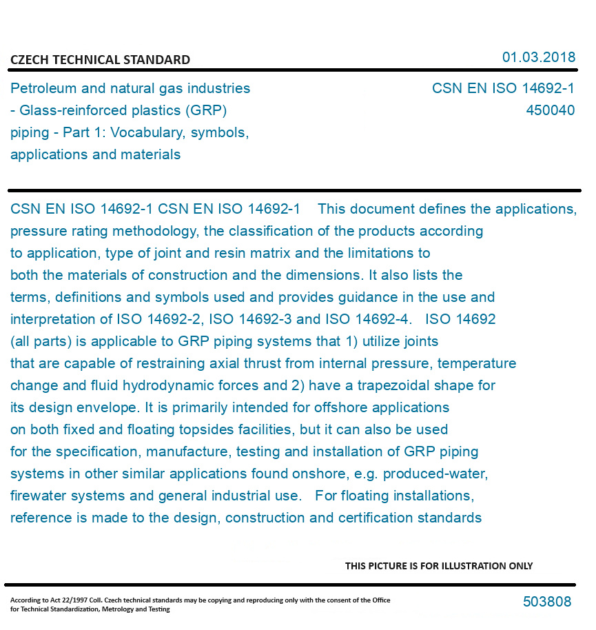 CSN EN ISO 14692-1 This document defines the applications, pressure rating methodology, the classification of the products according to application, type of joint and resin matrix and the limitations to both the materials of construction and the dimensions. It also lists the terms, definitions and symbols used and provides guidance in the use and interpretation of ISO 14692-2, ISO 14692-3 and ISO 14692-4. ISO 14692 (all parts) is applicable to GRP piping systems that 1) utilize joints that are capable of restraining axial thrust from internal pressure, temperature change and fluid hydrodynamic forces and 2) have a trapezoidal shape for its design envelope. It is primarily intended for offshore applications on both fixed and floating topsides facilities, but it can also be used for the specification, manufacture, testing and installation of GRP piping systems in other similar applications found onshore, e.g. produced-water, firewater systems and general industrial use. For floating installations, reference is made to the design, construction and certification standards for the hull or vessel, since these can allow alternative codes and standards for GRP piping associated with marine and/or ballast systems. However, it is recommended that ISO 14692 (all parts) be used for such applications to the maximum degree attainable. ISO 14692 (all parts) can also be used as the general basis for specification of pipe used for pump caissons, stilling tubes, I-tubes, seawater lift risers and other similar items. Original English text of CSN EN Standard. The price of the Standard included all amendments and correcturs.