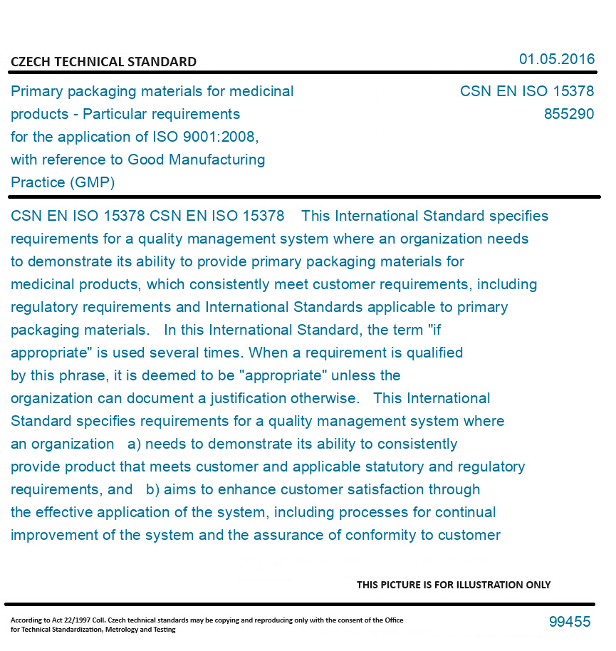 CSN EN ISO 15378 This International Standard specifies requirements for a quality management system where an organization needs to demonstrate its ability to provide primary packaging materials for medicinal products, which consistently meet customer requirements, including regulatory requirements and International Standards applicable to primary packaging materials. In this International Standard, the term "if appropriate" is used several times. When a requirement is qualified by this phrase, it is deemed to be "appropriate" unless the organization can document a justification otherwise. This International Standard specifies requirements for a quality management system where an organization a) needs to demonstrate its ability to consistently provide product that meets customer and applicable statutory and regulatory requirements, and b) aims to enhance customer satisfaction through the effective application of the system, including processes for continual improvement of the system and the assurance of conformity to customer and applicable statutory and regulatory requirements. NOTE 1: In this International Standard, the term "product" only applies to a) product intended for, or required by, a customer, b) any intended output resulting from the product realization processes. NOTE 2: Statutory and regulatory requirements can be expressed as legal requirements. This International Standard is an application standard for the design, manufacture and supply of primary packaging materials for medicinal products. It is also applicable for certification purposes. Original English text of CSN EN Standard. The price of the Standard included all amendments and correcturs.