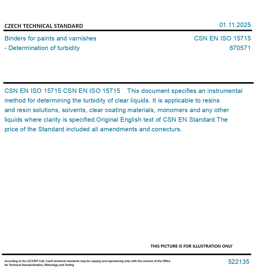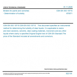 CSN EN ISO 15715 This document specifies an instrumental method for determining the turbidity of clear liquids. It is applicable to resins and resin solutions, solvents, clear coating materials, monomers and any other liquids where clarity is specified. Original English text of CSN EN Standard. The price of the Standard included all amendments and correcturs.