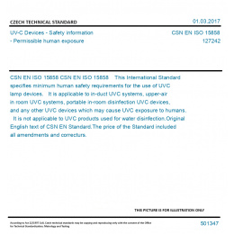 CSN EN ISO 15858 This International Standard specifies minimum human safety requirements for the use of UVC lamp devices. It is applicable to in-duct UVC systems, upper-air in room UVC systems, portable in-room disinfection UVC devices, and any other UVC devices which may cause UVC exposure to humans. It is not applicable to UVC products used for water disinfection. Original English text of CSN EN Standard. The price of the Standard included all amendments and correcturs.