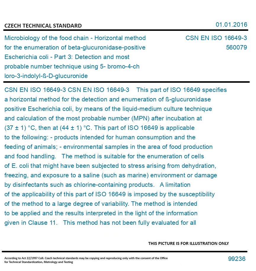 >CSN Standards>56 FOOD INDUSTRY PRODUCTS>5600 Testing methods and common regulations>CSN EN ISO 16649-3 - Microbiology of the food chain - Horizontal method for the enumeration of beta-glucuronidase-positive Escherichia coli - Part 3: Detection and most probable number technique using 5- bromo-4-chloro-3-indolyl-ß-D-glucuronide