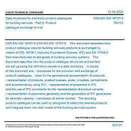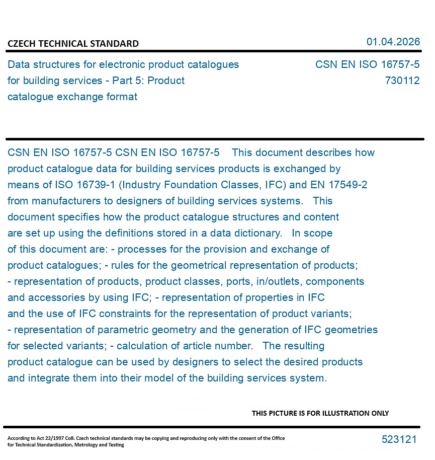 CSN EN ISO 16757-5 This document describes how product catalogue data for building services products is exchanged by means of ISO 16739-1 (Industry Foundation Classes, IFC) and EN 17549-2 from manufacturers to designers of building services systems. This document specifies how the product catalogue structures and content are set up using the definitions stored in a data dictionary. In scope of this document are: - processes for the provision and exchange of product catalogues; - rules for the geometrical representation of products; - representation of products, product classes, ports, in/outlets, components and accessories by using IFC; - representation of properties in IFC and the use of IFC constraints for the representation of product variants; - representation of parametric geometry and the generation of IFC geometries for selected variants; - calculation of article number. The resulting product catalogue can be used by designers to select the desired products and integrate them into their model of the building services system. The expected audience of this document are software providers for the built environment sector and professionals working in the sector who create product catalogues or use product catalogues by means of software tools. Not in scope of this document is the representation of properties in data dictionaries. The use of data dictionaries is described in ISO 16757-4.