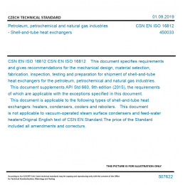 CSN EN ISO 16812 This document specifies requirements and gives recommendations for the mechanical design, material selection, fabrication, inspection, testing and preparation for shipment of shell-and-tube heat exchangers for the petroleum, petrochemical and natural gas industries. This document supplements API Std 660, 9th edition (2015), the requirements of which are applicable with the exceptions specified in this document. This document is applicable to the following types of shell-and-tube heat exchangers: heaters, condensers, coolers and reboilers. This document is not applicable to vacuum-operated steam surface condensers and feed-water heaters Original English text of CSN EN Standard. The price of the Standard included all amendments and correcturs.