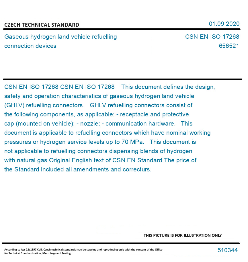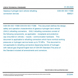 CSN EN ISO 17268 This document defines the design, safety and operation characteristics of gaseous hydrogen land vehicle (GHLV) refuelling connectors. GHLV refuelling connectors consist of the following components, as applicable: - receptacle and protective cap (mounted on vehicle); - nozzle; - communication hardware. This document is applicable to refuelling connectors which have nominal working pressures or hydrogen service levels up to 70 MPa. This document is not applicable to refuelling connectors dispensing blends of hydrogen with natural gas. Original English text of CSN EN Standard. The price of the Standard included all amendments and correcturs.
