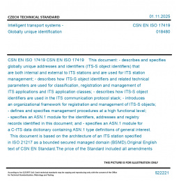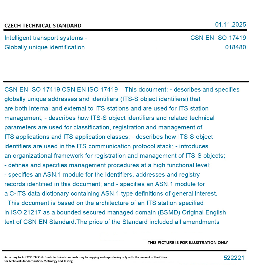 CSN EN ISO 17419 This document: - describes and specifies globally unique addresses and identifiers (ITS-S object identifiers) that are both internal and external to ITS stations and are used for ITS station management; - describes how ITS-S object identifiers and related technical parameters are used for classification, registration and management of ITS applications and ITS application classes; - describes how ITS-S object identifiers are used in the ITS communication protocol stack; - introduces an organizational framework for registration and management of ITS-S objects; - defines and specifies management procedures at a high functional level; - specifies an ASN.1 module for the identifiers, addresses and registry records identified in this document; and - specifies an ASN.1 module for a C-ITS data dictionary containing ASN.1 type definitions of general interest. This document is based on the architecture of an ITS station specified in ISO 21217 as a bounded secured managed domain (BSMD). Original English text of CSN EN Standard. The price of the Standard included all amendments and correcturs.