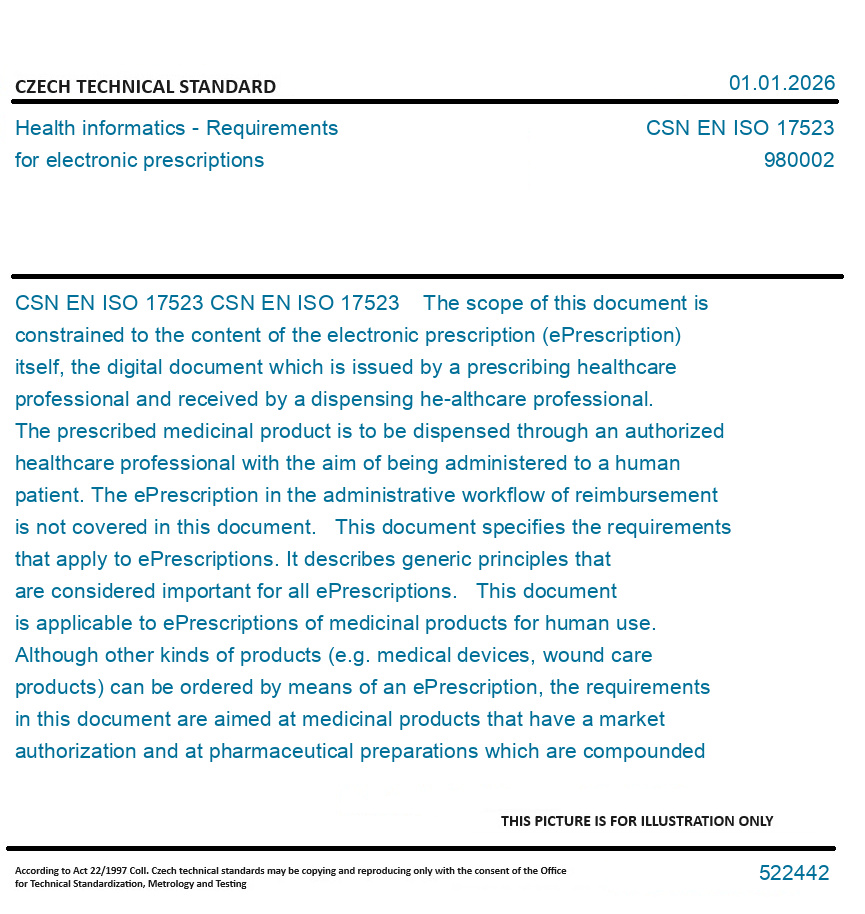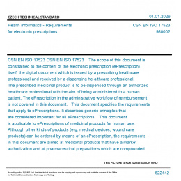 CSN EN ISO 17523 The scope of this document is constrained to the content of the electronic prescription (ePrescription) itself, the digital document which is issued by a prescribing healthcare professional and received by a dispensing he-althcare professional. The prescribed medicinal product is to be dispensed through an authorized healthcare professional with the aim of being administered to a human patient. The ePrescription in the administrative workflow of reimbursement is not covered in this document. This document specifies the requirements that apply to ePrescriptions. It describes generic principles that are considered important for all ePrescriptions. This document is applicable to ePrescriptions of medicinal products for human use. Although other kinds of products (e.g. medical devices, wound care products) can be ordered by means of an ePrescription, the requirements in this document are aimed at medicinal products that have a market authorization and at pharmaceutical preparations which are compounded in a pharmacy. This document specifies a list of data elements that can be considered as essential for ePrescriptions, depen-ding on jurisdiction or clinical setting (primary healthcare, hospital etc.). Ensuring the authenticity of these data elements is in scope and will have impact on the requirements of information systems.