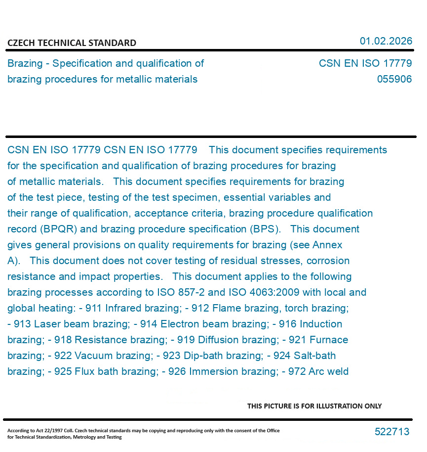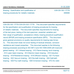 CSN EN ISO 17779 This document specifies requirements for the specification and qualification of brazing procedures for brazing of metallic materials. This document specifies requirements for brazing of the test piece, testing of the test specimen, essential variables and their range of qualification, acceptance criteria, brazing procedure qualification record (BPQR) and brazing procedure specification (BPS). This document gives general provisions on quality requirements for brazing (see Annex A). This document does not cover testing of residual stresses, corrosion resistance and impact properties. This document applies to the following brazing processes according to ISO 857-2 and ISO 4063:2009 with local and global heating: - 911 Infrared brazing; - 912 Flame brazing, torch brazing; - 913 Laser beam brazing; - 914 Electron beam brazing; - 916 Induction brazing; - 918 Resistance brazing; - 919 Diffusion brazing; - 921 Furnace brazing; - 922 Vacuum brazing; - 923 Dip-bath brazing; - 924 Salt-bath brazing; - 925 Flux bath brazing; - 926 Immersion brazing; - 972 Arc weld brazing. The principles of this document can be applied to other brazing processes and brazing of materials not listed.