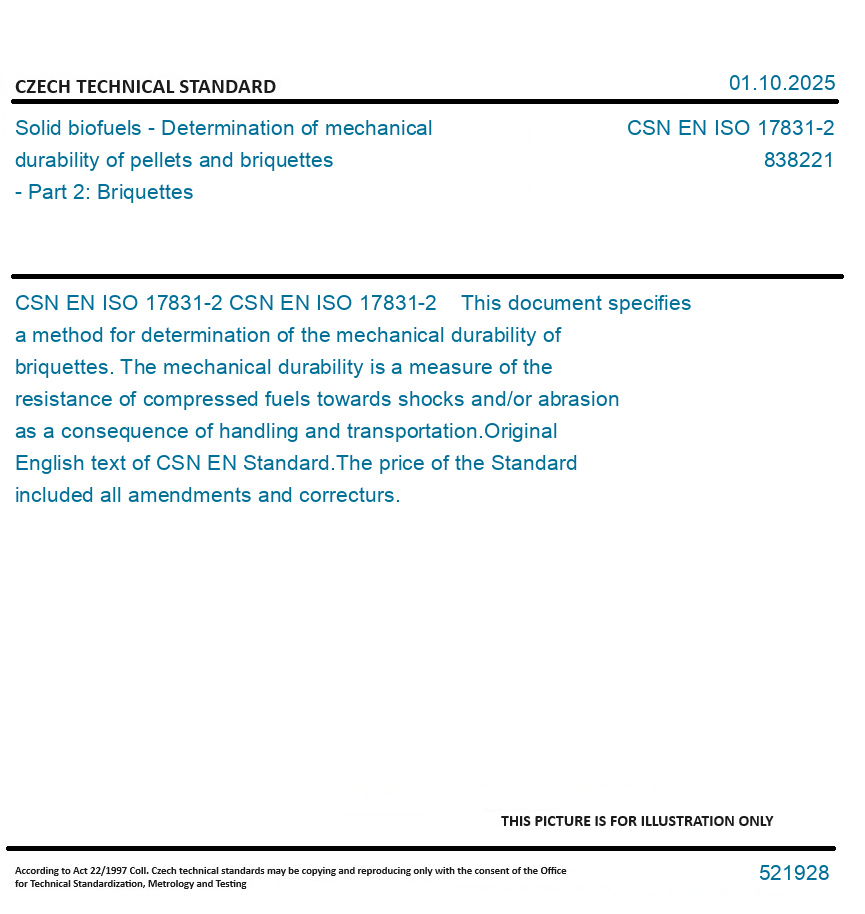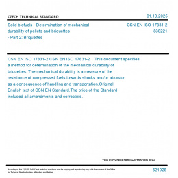 CSN EN ISO 17831-2 This document specifies a method for determination of the mechanical durability of briquettes. The mechanical durability is a measure of the resistance of compressed fuels towards shocks and/or abrasion as a consequence of handling and transportation. Original English text of CSN EN Standard. The price of the Standard included all amendments and correcturs.