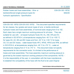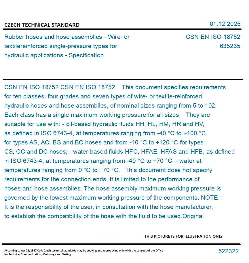 CSN EN ISO 18752 This document specifies requirements for ten classes, four grades and seven types of wire- or textile-reinforced hydraulic hoses and hose assemblies, of nominal sizes ranging from 5 to 102. Each class has a single maximum working pressure for all sizes. They are suitable for use with: - oil-based hydraulic fluids HH, HL, HM, HR and HV, as defined in ISO 6743-4, at temperatures ranging from -40 °C to +100 °C for types AS, AC, BS and BC hoses and from -40 °C to +120 °C for types CS, CC and DC hoses; - water-based fluids HFC, HFAE, HFAS and HFB, as defined in ISO 6743-4, at temperatures ranging from -40 °C to +70 °C; - water at temperatures ranging from 0 °C to +70 °C. This document does not specify requirements for the connection ends. It is limited to the performance of hoses and hose assemblies. The hose assembly maximum working pressure is governed by the lowest maximum working pressure of the components. NOTE - It is the responsibility of the user, in consultation with the hose manufacturer, to establish the compatibility of the hose with the fluid to be used. Original English text of CSN EN Standard. The price of the Standard included all amendments and correcturs.