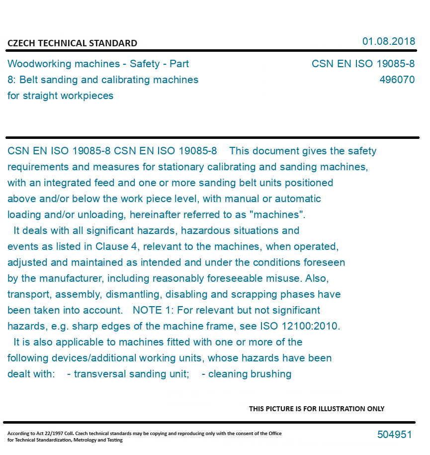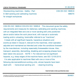CSN EN ISO 19085-8 This document gives the safety requirements and measures for stationary calibrating and sanding machines, with an integrated feed and one or more sanding belt units positioned above and/or below the work piece level, with manual or automatic loading and/or unloading, hereinafter referred to as "machines". It deals with all significant hazards, hazardous situations and events as listed in Clause 4, relevant to the machines, when operated, adjusted and maintained as intended and under the conditions foreseen by the manufacturer, including reasonably foreseeable misuse. Also, transport, assembly, dismantling, disabling and scrapping phases have been taken into account. NOTE 1: For relevant but not significant hazards, e.g. sharp edges of the machine frame, see ISO 12100:2010. It is also applicable to machines fitted with one or more of the following devices/additional working units, whose hazards have been dealt with: - transversal sanding unit; - cleaning brushing unit; - satining roller unit; - disk brushing unit; - texturing brushing roller unit; - texturing brushing belt unit; - cutterblock unit; - texturing band saw unit; - spiked roller unit; - antistatic bars; - conveyor directly controlled by the machine; - additional work piece vacuum clamping device. The machines are designed to calibrate and/or sand work pieces, in shape of panels or beams, consisting of: a) solid wood; b) material with similar physical characteristics to wood (see ISO 19085-1:2017, 3.2); c) gypsum boards, gypsum bounded fibreboards; d) composite materials with core consisting of e.g. polyurethane or mineral material; e) composite boards made from the materials listed above; f) all materials listed above, also already lacquered. This document does not deal with hazards related to: - specific devices other than those listed above; - access through in-feed and out-feed openings of machines with a work piece height capacity greater than 550 mm; - systems for automatic loading and/or unloading of the work piece to/from a single machine; NOTE 2: Loading the machine manually includes manually placing the work piece onto a conveyor directly controlled by the machine. Unloading the machine manually includes manually removing the work piece from a conveyor directly controlled by the machine. - interfacing of the machine with any other machine. It is not applicable to machines intended for use in potentially explosive atmosphere and to machines manufactured prior to the date of its publication. Original English text of CSN EN Standard. The price of the Standard included all amendments and correcturs.