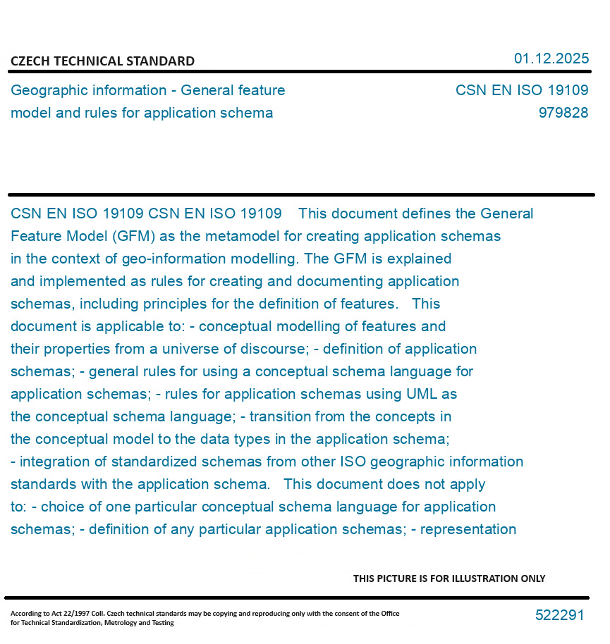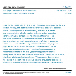 CSN EN ISO 19109 This document defines the General Feature Model (GFM) as the metamodel for creating application schemas in the context of geo-information modelling. The GFM is explained and implemented as rules for creating and documenting application schemas, including principles for the definition of features. This document is applicable to: - conceptual modelling of features and their properties from a universe of discourse; - definition of application schemas; - general rules for using a conceptual schema language for application schemas; - rules for application schemas using UML as the conceptual schema language; - transition from the concepts in the conceptual model to the data types in the application schema; - integration of standardized schemas from other ISO geographic information standards with the application schema. This document does not apply to: - choice of one particular conceptual schema language for application schemas; - definition of any particular application schemas; - representation of feature types and their properties in a feature catalogue; - representation of metadata; - rules for mapping one application schema to another; - implementation of the application schema in a computer environment; - computer system and application software design; - programming. Original English text of CSN EN Standard. The price of the Standard included all amendments and correcturs.