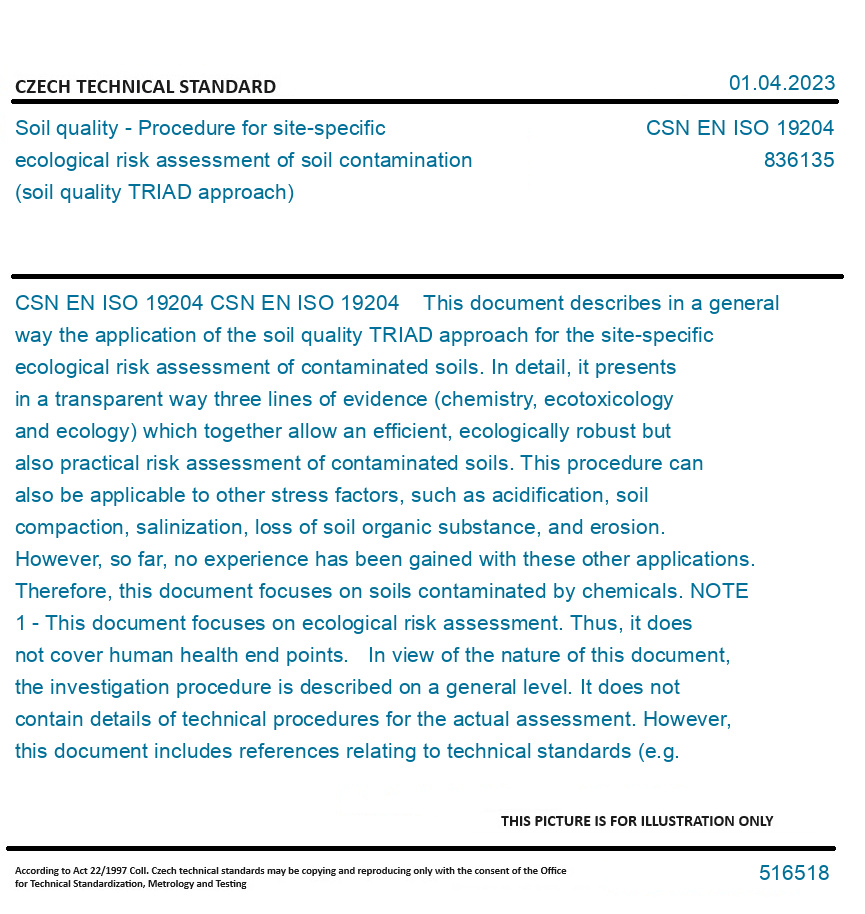 CSN EN ISO 19204 This document describes in a general way the application of the soil quality TRIAD approach for the site-specific ecological risk assessment of contaminated soils. In detail, it presents in a transparent way three lines of evidence (chemistry, ecotoxicology and ecology) which together allow an efficient, ecologically robust but also practical risk assessment of contaminated soils. This procedure can also be applicable to other stress factors, such as acidification, soil compaction, salinization, loss of soil organic substance, and erosion. However, so far, no experience has been gained with these other applications. Therefore, this document focuses on soils contaminated by chemicals. NOTE 1 - This document focuses on ecological risk assessment. Thus, it does not cover human health end points. In view of the nature of this document, the investigation procedure is described on a general level. It does not contain details of technical procedures for the actual assessment. However, this document includes references relating to technical standards (e.g. ISO 15799, ISO 17616) which are useful for the actual performance of the three lines of evidence. In ecological risk assessment, the effects of soil contamination on the ecosystem are related to the intended land use and the requirements that this use sets for properly functioning soil. This document describes the basic steps relating to a coherent tool for a site-specific risk assessment with opportunities to work out site-specific details. This document can also be used for the evaluation of clean-up operations, remediation processes or management measures (i.e. for the evaluation of the environmental quality after having performed such actions). NOTE 2 - This document starts when it has already been decided that an ecological risk assessment at a given site needs to be performed. In other words, the practical performance of the soil quality TRIAD and the evaluation of the individual test results will be described. Thus, nothing will be said about decisions whether (and if yes, how) the results of the assessment are included in soil management measures or not. NOTE 3 - The TRIAD approach can be used for different parts of the environment, but this document focuses mostly on the soil compartment. Comparable documents for other environmental compartments are intended to be prepared in addition (e.g. the terrestrial aboveground compartment) in order to perform a complete site assessment, based on the same principles and processes. Original English text of CSN EN Standard. The price of the Standard included all amendments and correcturs.