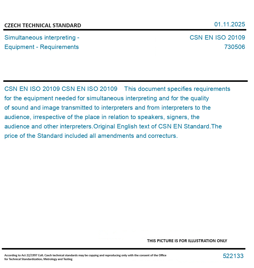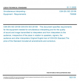CSN EN ISO 20109 This document specifies requirements for the equipment needed for simultaneous interpreting and for the quality of sound and image transmitted to interpreters and from interpreters to the audience, irrespective of the place in relation to speakers, signers, the audience and other interpreters. Original English text of CSN EN Standard. The price of the Standard included all amendments and correcturs.