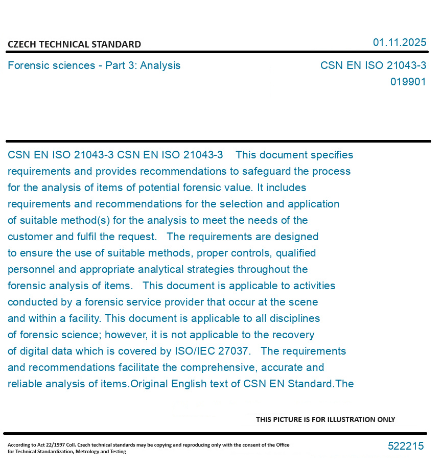 CSN EN ISO 21043-3 This document specifies requirements and provides recommendations to safeguard the process for the analysis of items of potential forensic value. It includes requirements and recommendations for the selection and application of suitable method(s) for the analysis to meet the needs of the customer and fulfil the request. The requirements are designed to ensure the use of suitable methods, proper controls, qualified personnel and appropriate analytical strategies throughout the forensic analysis of items. This document is applicable to activities conducted by a forensic service provider that occur at the scene and within a facility. This document is applicable to all disciplines of forensic science; however, it is not applicable to the recovery of digital data which is covered by ISO/IEC 27037. The requirements and recommendations facilitate the comprehensive, accurate and reliable analysis of items. Original English text of CSN EN Standard. The price of the Standard included all amendments and correcturs.