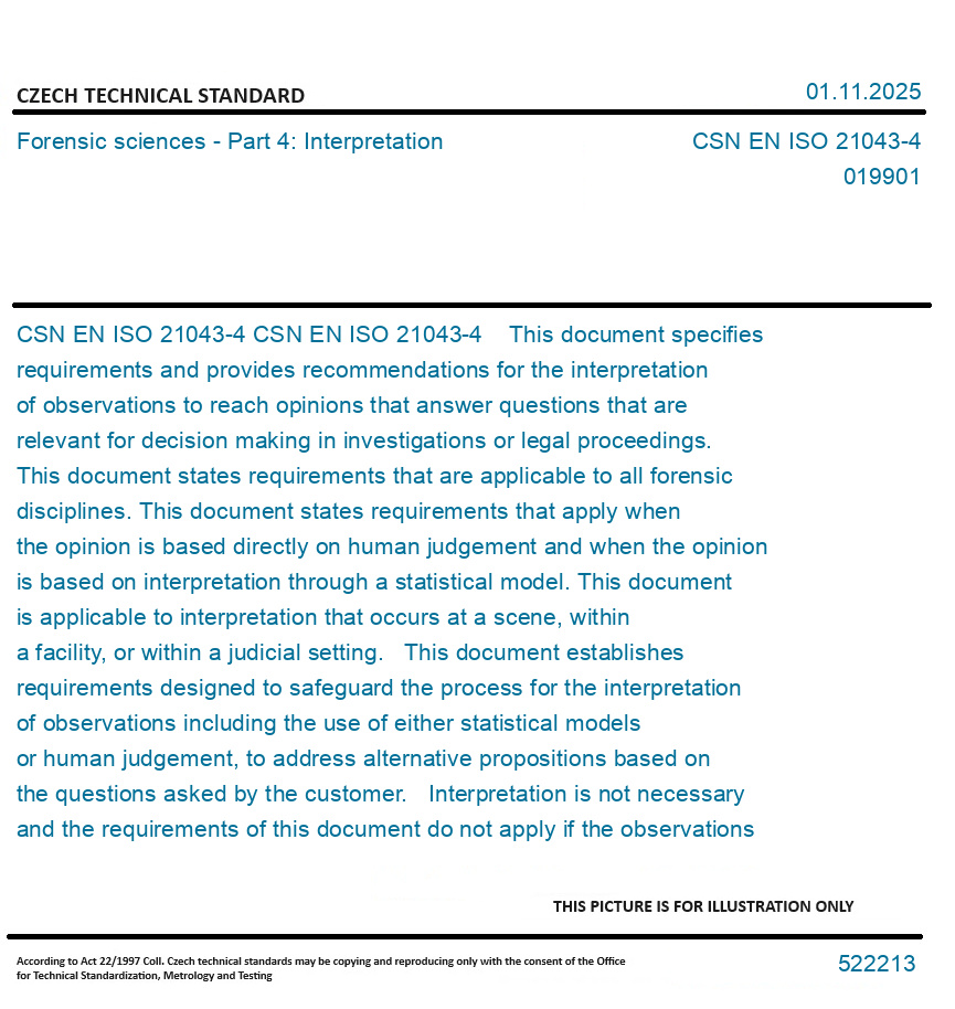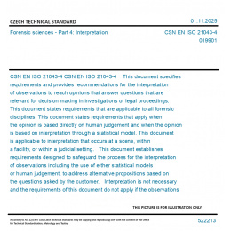 CSN EN ISO 21043-4 This document specifies requirements and provides recommendations for the interpretation of observations to reach opinions that answer questions that are relevant for decision making in investigations or legal proceedings. This document states requirements that are applicable to all forensic disciplines. This document states requirements that apply when the opinion is based directly on human judgement and when the opinion is based on interpretation through a statistical model. This document is applicable to interpretation that occurs at a scene, within a facility, or within a judicial setting. This document establishes requirements designed to safeguard the process for the interpretation of observations including the use of either statistical models or human judgement, to address alternative propositions based on the questions asked by the customer. Interpretation is not necessary and the requirements of this document do not apply if the observations resulting from the analysis directly answer the relevant question. Original English text of CSN EN Standard. The price of the Standard included all amendments and correcturs.