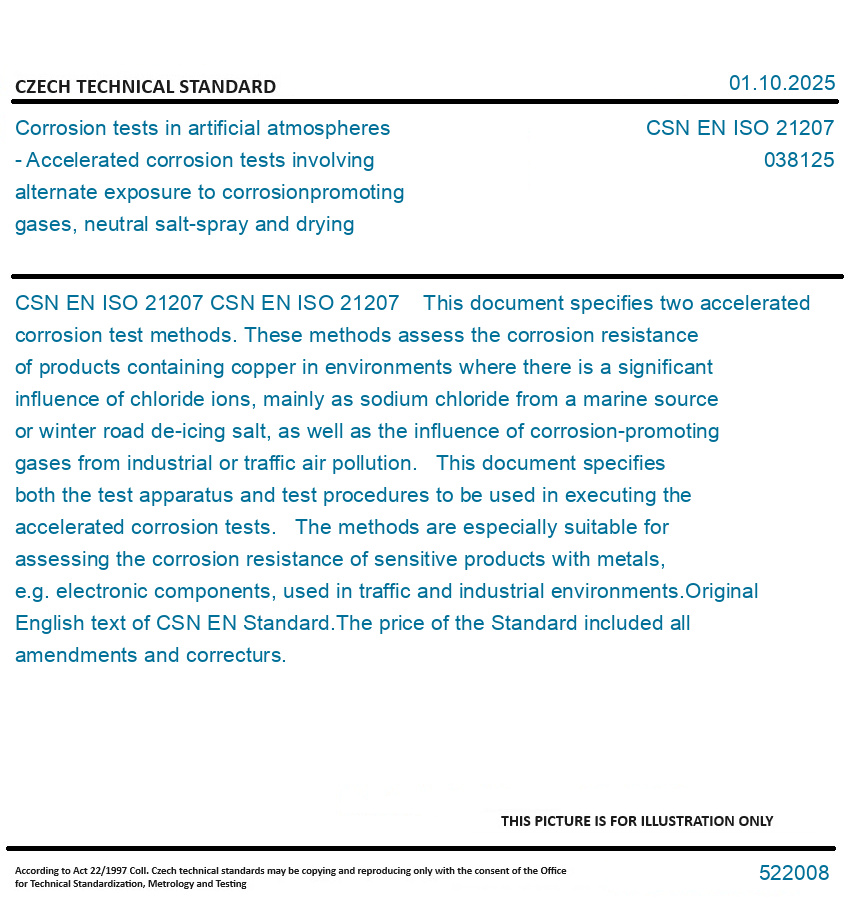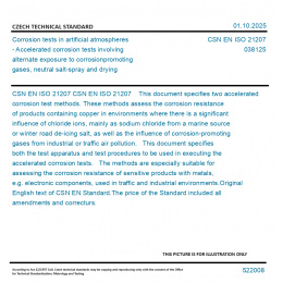 CSN EN ISO 21207 This document specifies two accelerated corrosion test methods. These methods assess the corrosion resistance of products containing copper in environments where there is a significant influence of chloride ions, mainly as sodium chloride from a marine source or winter road de-icing salt, as well as the influence of corrosion-promoting gases from industrial or traffic air pollution. This document specifies both the test apparatus and test procedures to be used in executing the accelerated corrosion tests. The methods are especially suitable for assessing the corrosion resistance of sensitive products with metals, e.g. electronic components, used in traffic and industrial environments. Original English text of CSN EN Standard. The price of the Standard included all amendments and correcturs.