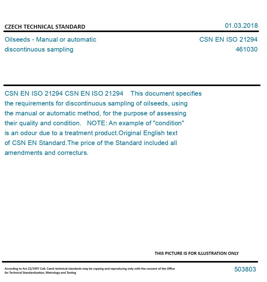 CSN EN ISO 21294 This document specifies the requirements for discontinuous sampling of oilseeds, using the manual or automatic method, for the purpose of assessing their quality and condition. NOTE: An example of "condition" is an odour due to a treatment product. Original English text of CSN EN Standard. The price of the Standard included all amendments and correcturs.