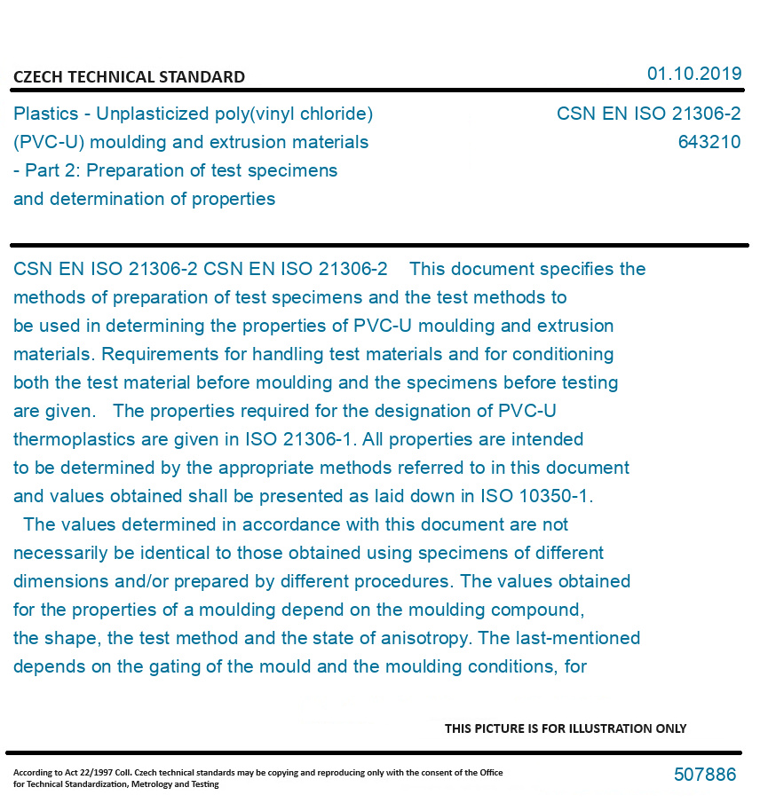 CSN EN ISO 21306-2 This document specifies the methods of preparation of test specimens and the test methods to be used in determining the properties of PVC-U moulding and extrusion materials. Requirements for handling test materials and for conditioning both the test material before moulding and the specimens before testing are given. The properties required for the designation of PVC-U thermoplastics are given in ISO 21306-1. All properties are intended to be determined by the appropriate methods referred to in this document and values obtained shall be presented as laid down in ISO 10350-1. The values determined in accordance with this document are not necessarily be identical to those obtained using specimens of different dimensions and/or prepared by different procedures. The values obtained for the properties of a moulding depend on the moulding compound, the shape, the test method and the state of anisotropy. The last-mentioned depends on the gating of the mould and the moulding conditions, for example temperature, pressure and injection rate. Any subsequent treatment is also be considered, for example conditioning or annealing. The thermal history and the internal stresses of the specimens can strongly influence the thermal and mechanical properties and the resistance to environmental stress cracking, but exert less effect on the electrical properties, which depend mainly on the chemical composition of the moulding compound. In order to obtain reproducible and comparable test results, the methods of preparation and conditioning, the specimen dimensions and the test procedures specified herein are used. Values determined are not necessarily be identical to those obtained using specimens of different dimensions or prepared using different procedures. Original English text of CSN EN Standard. The price of the Standard included all amendments and correcturs.