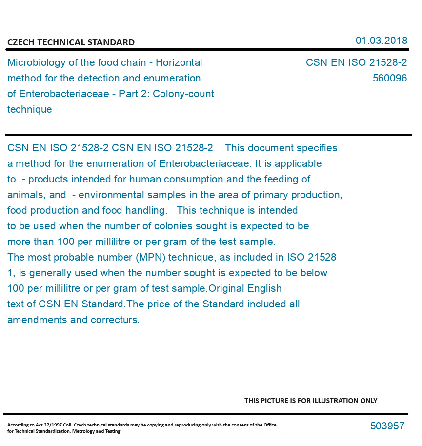 CSN EN ISO 21528-2 This document specifies a method for the enumeration of Enterobacteriaceae. It is applicable to - products intended for human consumption and the feeding of animals, and - environmental samples in the area of primary production, food production and food handling. This technique is intended to be used when the number of colonies sought is expected to be more than 100 per millilitre or per gram of the test sample. The most probable number (MPN) technique, as included in ISO 21528 1, is generally used when the number sought is expected to be below 100 per millilitre or per gram of test sample. Original English text of CSN EN Standard. The price of the Standard included all amendments and correcturs.