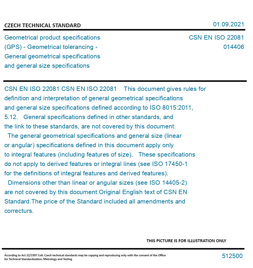 CSN EN ISO 22081 This document gives rules for definition and interpretation of general geometrical specifications and general size specifications defined according to ISO 8015:2011, 5.12. General specifications defined in other standards, and the link to these standards, are not covered by this document. The general geometrical specifications and general size (linear or angular) specifications defined in this document apply only to integral features (including features of size). These specifications do not apply to derived features or integral lines (see ISO 17450-1 for the definitions of integral features and derived features). Dimensions other than linear or angular sizes (see ISO 14405-2) are not covered by this document. Original English text of CSN EN Standard. The price of the Standard included all amendments and correcturs.