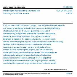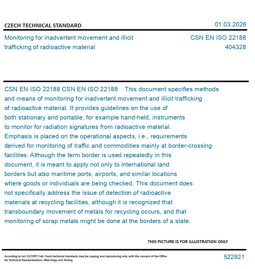 CSN EN ISO 22188 This document specifies methods and means of monitoring for inadvertent movement and illicit trafficking of radioactive material. It provides guidelines on the use of both stationary and portable, for example hand-held, instruments to monitor for radiation signatures from radioactive material. Emphasis is placed on the operational aspects, i.e., requirements derived for monitoring of traffic and commodities mainly at border-crossing facilities. Although the term border is used repeatedly in this document, it is meant to apply not only to international land borders but also maritime ports, airports, and similar locations where goods or individuals are being checked. This document does not specifically address the issue of detection of radioactive materials at recycling facilities, although it is recognized that transboundary movement of metals for recycling occurs, and that monitoring of scrap metals might be done at the borders of a state. This document is applicable to - regulatory bodies and other competent authorities seeking guidance on implementation of action plans to combat illicit trafficking, - law enforcement agencies, for example border guards, to obtain guidelines on recommended monitoring procedures, - equipment manufacturers in order to understand minimum requirements derived from operational necessities according to this document, and - end-users of radiation detection equipment applicable to this document.