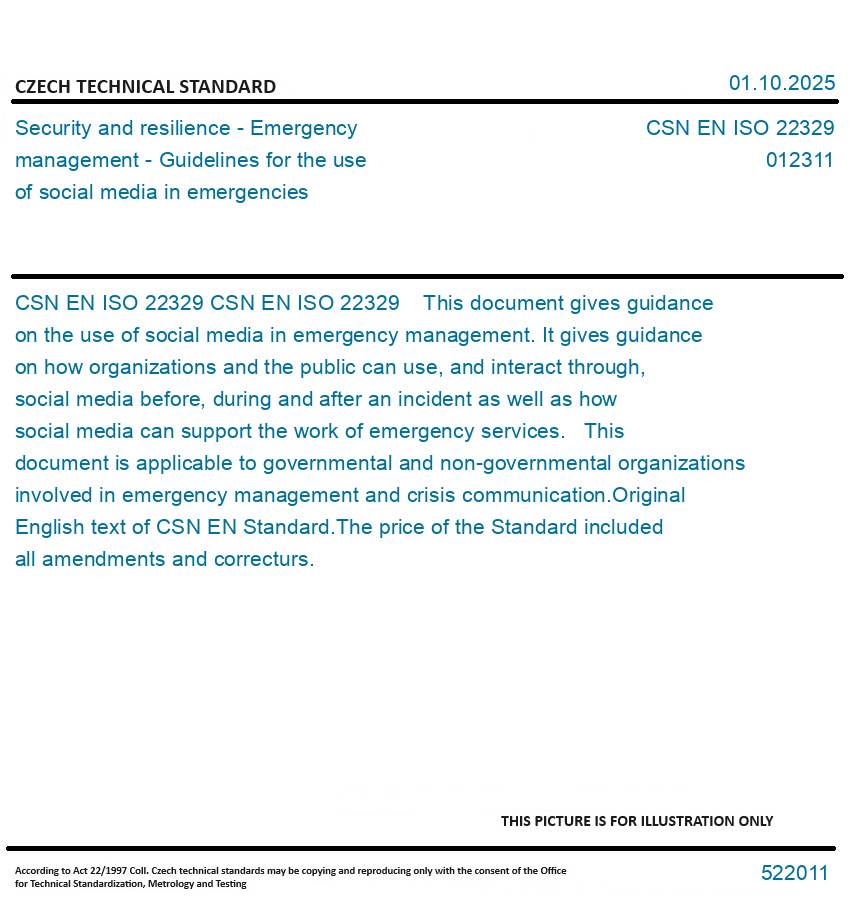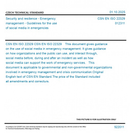 >CSN Standards>01 GENERAL CLASS>0123 >CSN EN ISO 22329 - Security and resilience - Emergency management - Guidelines for the use of social media in emergencies