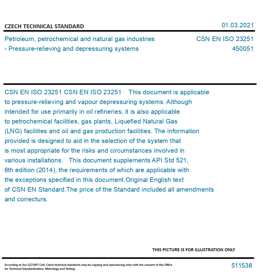 CSN EN ISO 23251 This document is applicable to pressure-relieving and vapour depressuring systems. Although intended for use primarily in oil refineries, it is also applicable to petrochemical facilities, gas plants, Liquefied Natural Gas (LNG) facilities and oil and gas production facilities. The information provided is designed to aid in the selection of the system that is most appropriate for the risks and circumstances involved in various installations. This document supplements API Std 521, 6th edition (2014), the requirements of which are applicable with the exceptions specified in this document. Original English text of CSN EN Standard. The price of the Standard included all amendments and correcturs.