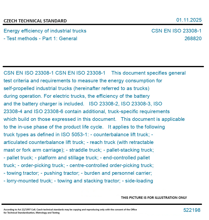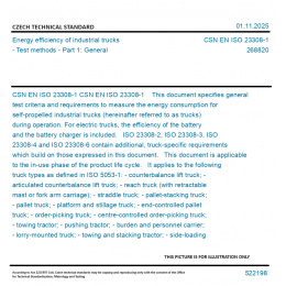 CSN EN ISO 23308-1 This document specifies general test criteria and requirements to measure the energy consumption for self-propelled industrial trucks (hereinafter referred to as trucks) during operation. For electric trucks, the efficiency of the battery and the battery charger is included. ISO 23308-2, ISO 23308-3, ISO 23308-4 and ISO 23308-6 contain additional, truck-specific requirements which build on those expressed in this document. This document is applicable to the in-use phase of the product life cycle. It applies to the following truck types as defined in ISO 5053-1: - counterbalance lift truck; - articulated counterbalance lift truck; - reach truck (with retractable mast or fork arm carriage); - straddle truck; - pallet-stacking truck; - pallet truck; - platform and stillage truck; - end-controlled pallet truck; - order-picking truck; - centre-controlled order-picking truck; - towing tractor; - pushing tractor; - burden and personnel carrier; - lorry-mounted truck; - towing and stacking tractor; - side-loading truck (one side only); - variable-reach container handler; - counterbalance container handler; - lateral-stacking truck (both sides); - lateral-stacking truck (three sides); - multi-directional lift truck; - variable-reach truck; - platform truck; - double-stacker; - rough-terrain truck; - rough-terrain variable-reach truck; - slewing rough-terrain variable-reach truck; - stacking high-lift straddle carrier. Original English text of CSN EN Standard. The price of the Standard included all amendments and correcturs.