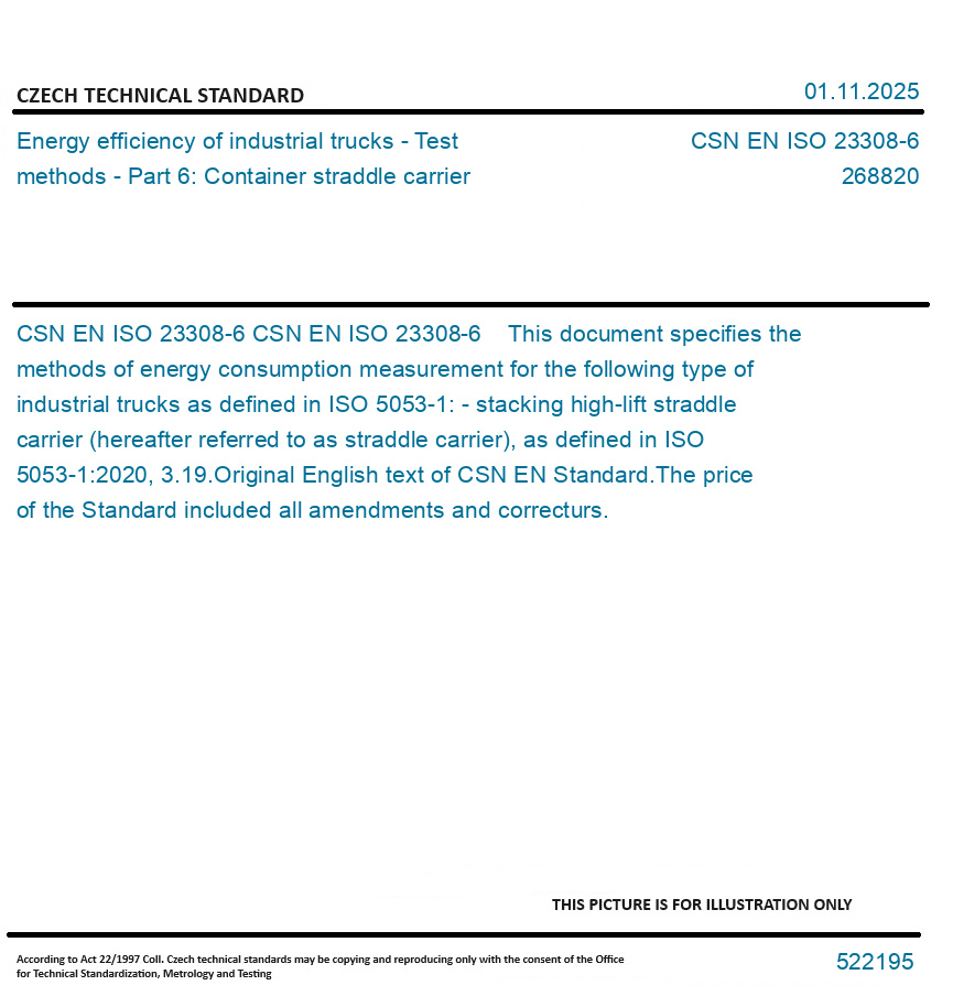 CSN EN ISO 23308-6 This document specifies the methods of energy consumption measurement for the following type of industrial trucks as defined in ISO 5053-1: - stacking high-lift straddle carrier (hereafter referred to as straddle carrier), as defined in ISO 5053-1:2020, 3.19. Original English text of CSN EN Standard. The price of the Standard included all amendments and correcturs.