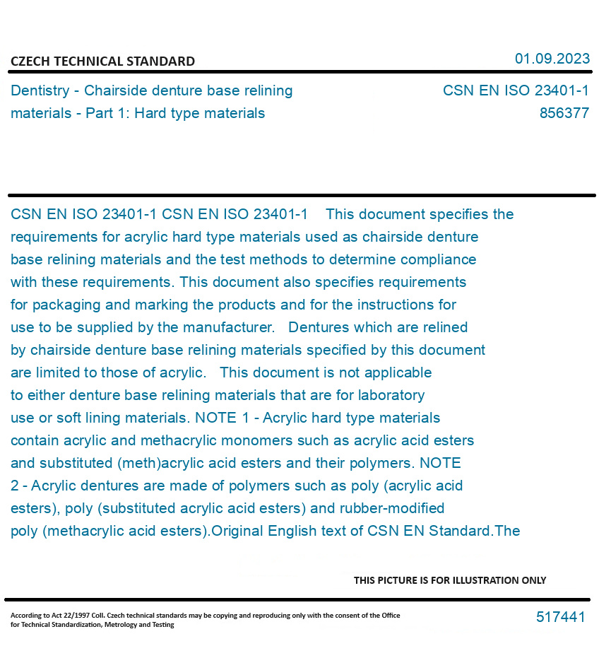 CSN EN ISO 23401-1 This document specifies the requirements for acrylic hard type materials used as chairside denture base relining materials and the test methods to determine compliance with these requirements. This document also specifies requirements for packaging and marking the products and for the instructions for use to be supplied by the manufacturer. Dentures which are relined by chairside denture base relining materials specified by this document are limited to those of acrylic. This document is not applicable to either denture base relining materials that are for laboratory use or soft lining materials. NOTE 1 - Acrylic hard type materials contain acrylic and methacrylic monomers such as acrylic acid esters and substituted (meth)acrylic acid esters and their polymers. NOTE 2 - Acrylic dentures are made of polymers such as poly (acrylic acid esters), poly (substituted acrylic acid esters) and rubber-modified poly (methacrylic acid esters). Original English text of CSN EN Standard. The price of the Standard included all amendments and correcturs.